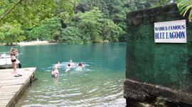 Blue Lagoon is seven miles east of Port Antonio, surrounded by steep hillsides and dense green vegetation. Some claim it to be "bottomless", but experts proclaim it to be about 200 feet at its deepest point. the lagoon is made up of sea water entering from the surface; the surface of the lagoon meets the surface of the Caribbean Sea.