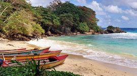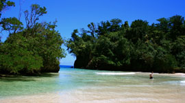 This little cove of soft, silver sand is sheltered by jungle-covered cliffs, and cleave, green stream meanders around the edge into the sea. The beach shelves quite steeply underwater, so the undertow can be strong; but in places the stream is deep enough to bathe in, as it runs over the sand.